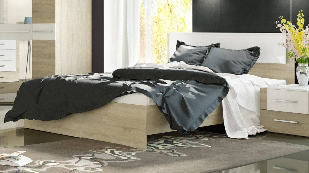 Отлично впишется в современный и стильный интерьер спальни. Глянцевые вставки из эмалированного ДСП удачно сочетаются с древесной текстурой.