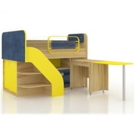 Внизу выкатной стол с дополнительной откидной столешницей. Глубина с выдвинутым столом — 1675 мм. Глубина с выдвинутым столом и разложенной столешницей — 2405 мм. Слева в торце за сдвижными дверьми ниша со штангой для одежды. В комплекте реечный настил. Матрас в комплект не входит. Размер матраса 1900х800 мм.