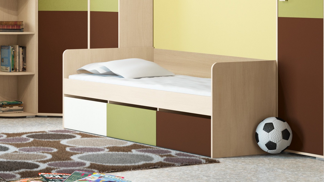 За счёт наличия трёх легко выдвигающихся вместительных ящиков эта модель позволит существенно сэкономить свободное пространство комнаты. Они предназначены для хранения самых разных вещей. Убрав постельные принадлежности, кровать можно превратить днём в удобную тахту. И её размеры (2032×834×660 мм) позволят вам не беспокоиться о том, что ребёнку вскоре понадобиться более просторная спальная мебель.