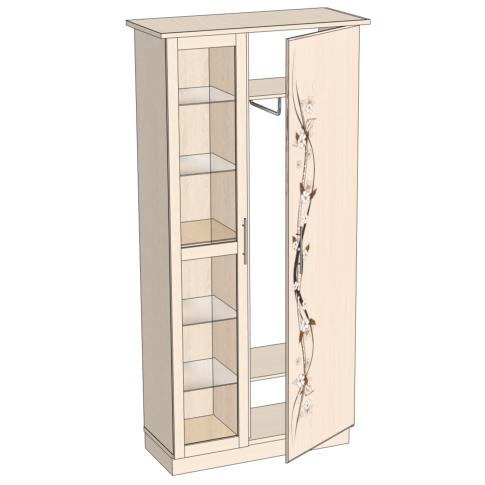 Слева за распашной рамочной стеклодверью — стеклополки; справа за распашной дверью — выдвижная штанга для одежды.