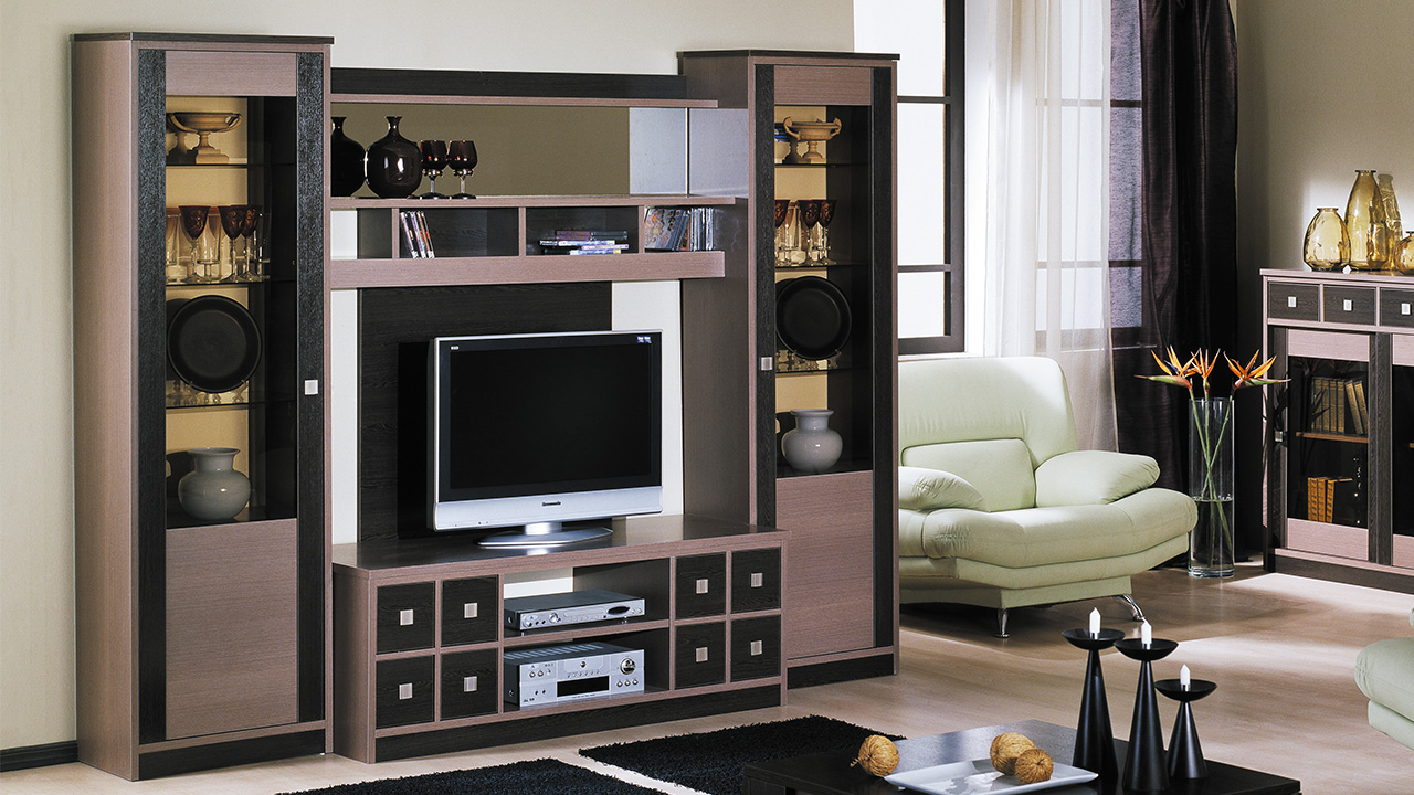 Четкие геометричные формы каркасных и фасадных деталей подчеркнуты необычными ручками в виде квадратов. Необычное цветовое сочетание текстур «Венге Конго» и «Венге Цава» наполнят любую гостиную атмосферой элегантности и загадочности. Стеклянные витрины для посуды, ящики для мелких предметов, полки для предметов декора, большая ниша для LCD- монитора обеспечат порядок и комфорт.