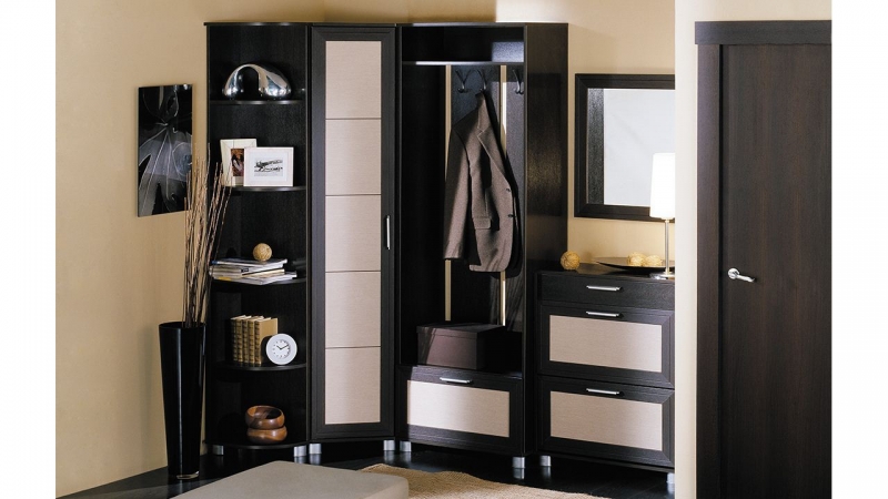Артикул Т ГН-119.003 Вместительный угловой шкаф, дополненный открытой секцией, торцевым стеллажом, комбинированной тумбой и настенным панельным зеркалом, позволит создать в вашей прихожей максимально комфортную обстановку, используя минимум свободного места. Мебель выполнена в респектабельном сочетании контрастных оттенков натуральной древесины с учётом эргономичности и удобства.